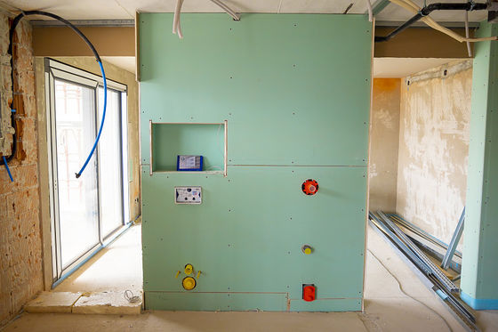 De waterbestendige die gipsraad, als groene raad of vochtigheid-bestand die ook gipsraad wordt bekend, is een bouwmateriaal voor muren en plafonds op gebieden wordt gebruikt waar de vochtigheid waarschijnlijk, zoals badkamerss, keukens, en wasserijruimten zal aanwezig zijn.
